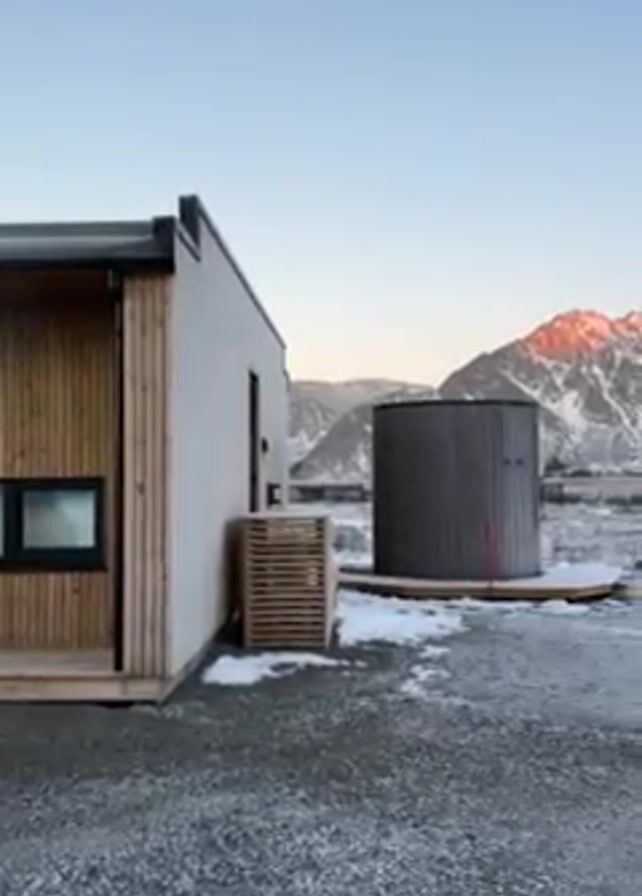 The camera pans across a landscape featuring a small, modern cabin with light wood siding and black trim, accompanied by a cylindrical wooden structure, possibly a hot tub or sauna