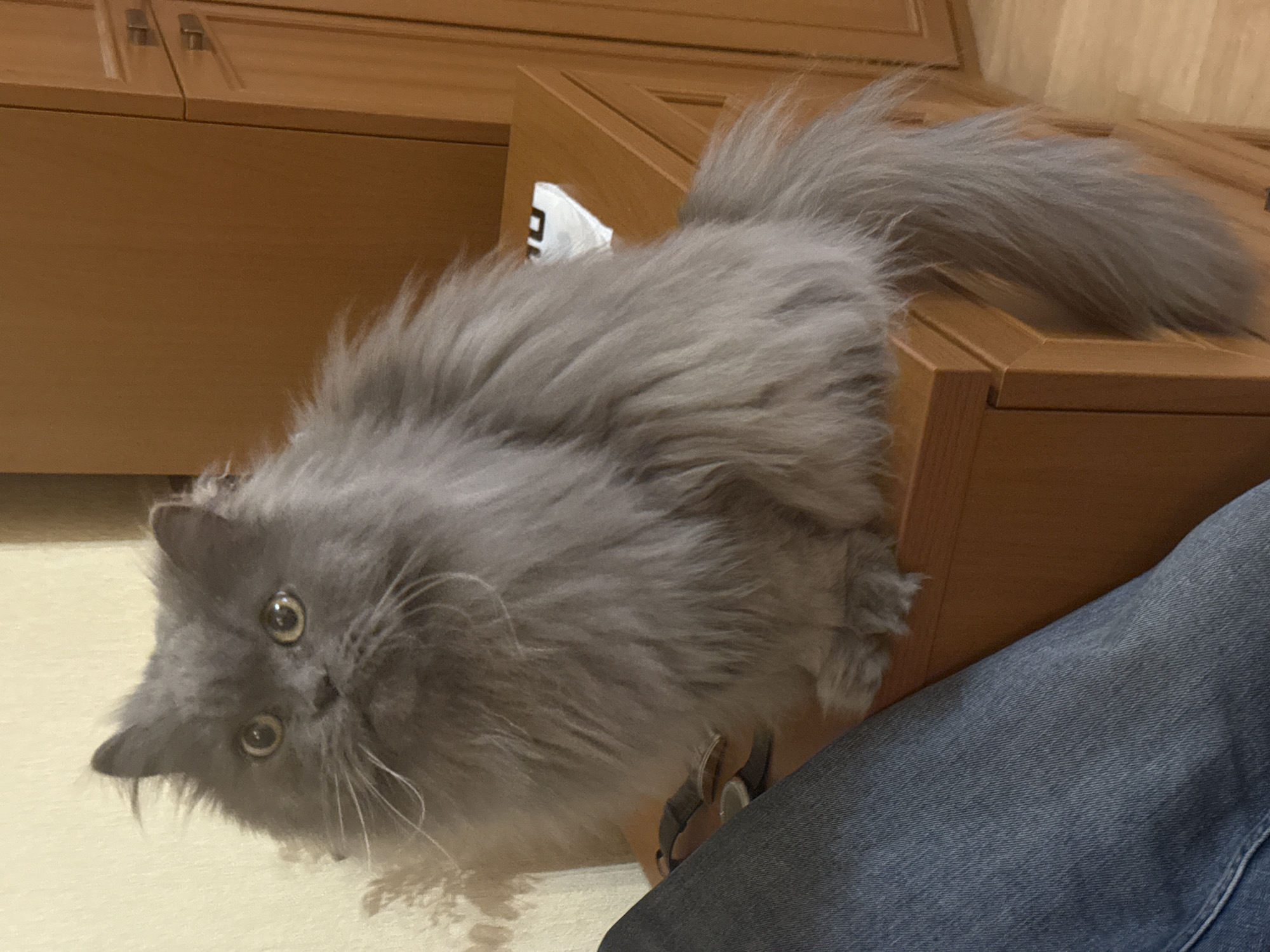 A grey Persian cat is positioned on the edge of a wooden dresser, its body partially overlapping the surface. The cat has fluffy fur, a long tail that extends horizontally, and large, round eyes. Below the dresser, a portion of a person's leg covered in blue denim is visible. The background includes wooden cabinetry. The location is not discernible from the image.