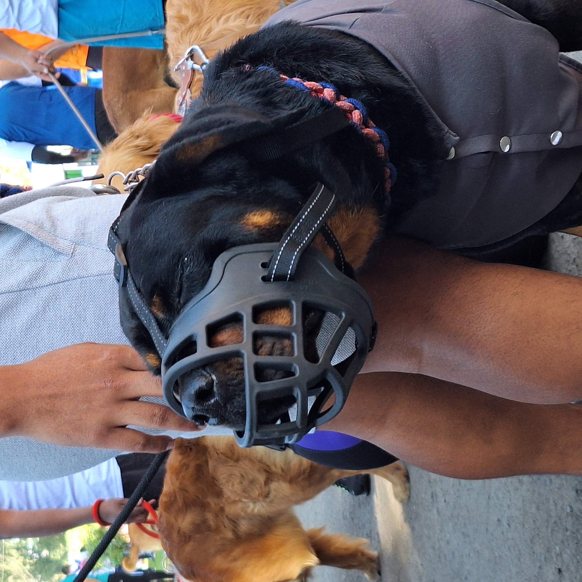 A close-up, medium shot shows a black Rottweiler wearing a black muzzle and a dark grey vest. The dog is resting its head on the legs of a person. The person, visible from the waist down, has dark skin and is wearing dark shorts. Another person, clad in a light grey short-sleeved shirt, is near the dog, with their hand close to the Rottweiler's head. The Rottweiler also has a leash that appears to be attached to the muzzle. Partially visible below the Rottweiler is a golden retriever. Further down, another person can be seen holding the leash of the golden retriever. Some people are partially visible in the background, wearing blue and white shirts. The location is implied to be Arequipa, Peru, based on user instructions. However, no specific visual cues in the image corroborate this location. The image appears to have been taken outdoors, potentially during an event or gathering.