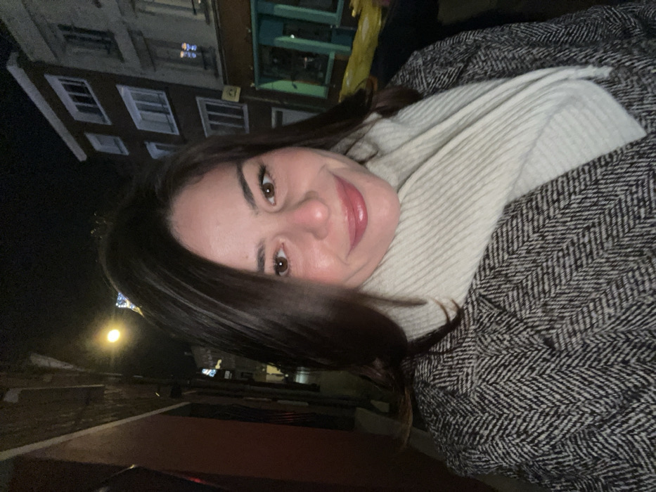 A woman in a herringbone coat and cream turtleneck poses for a selfie at night