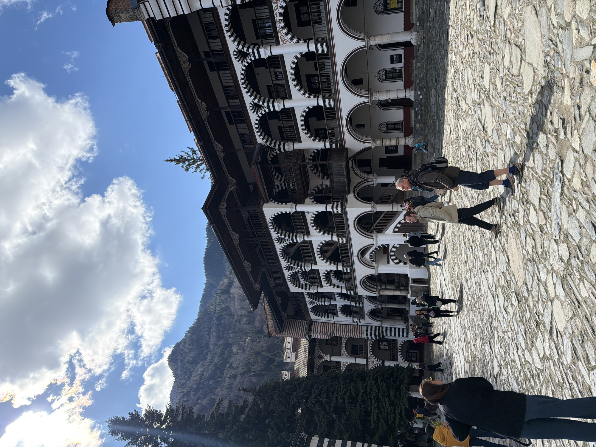 The image captures a courtyard scene at Rilski Manastir, Bulgaria, under a partly cloudy sky