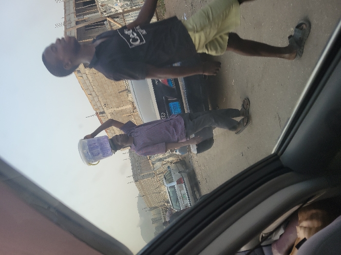 Two men are seen outside of a car, one carrying a blue and white container on his head. The man in front is wearing a black t-shirt and yellow shorts with sandals. The second man is wearing a purple shirt, gray pants and sandals. There are cars parked in the background. A car window and frame are visible in the foreground.