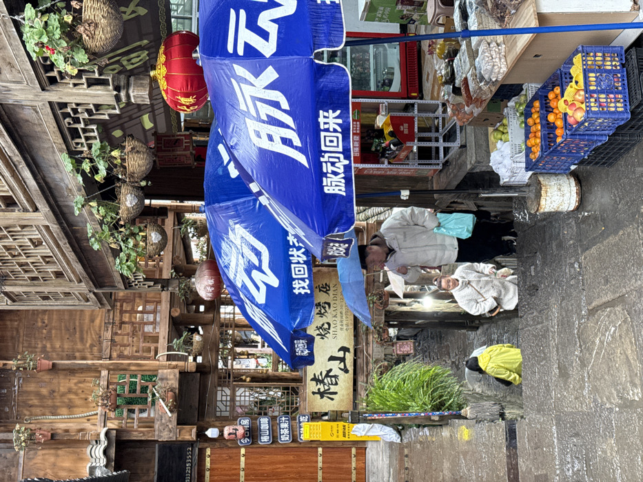 The image depicts a narrow, wet stone-stepped alleyway in the city of Gongtan, China, under overcast or rainy conditions. Traditional multi-story wooden buildings with intricate lattice windows, balconies, and ornate eaves line both sides of the steep passageway. Hanging baskets containing green plants are suspended from the buildings, and red lanterns, one prominently on the right, illuminate the scene. In the foreground, two large blue market umbrellas, branded with Chinese characters including "找回状元" (find the champion) and "脉动回来" (pulse back, a brand slogan), extend over a market stall on the right. This stall displays various produce, including oranges and apples in blue crates, and other packaged goods on a wooden table. A red refrigerator and metal shelving are visible behind the stall. Three individuals navigate the wet stone steps. A man in a light-colored jacket and dark pants descends the steps, holding a small light-blue umbrella over his head and carrying a light-blue plastic bag in his left hand. Directly behind him and slightly lower on the steps, a woman in a light-colored coat with her hair pulled back ascends. Further down and to the left, a third person, partially obscured, is visible in a bright yellow raincoat, also ascending the steps. Signs in Chinese characters are affixed to the wooden buildings, including "椿山 烧烤店" (Chunshan BBQ Restaurant) on the left, and a vertical sign listing "今天房" (today's room), "榕山咖啡" (Banyan Mountain Coffee), and "奶茶果汁" (milk tea juice). The stone steps appear slick with moisture, reflecting the ambient light. A rusty cylindrical object, possibly an umbrella stand base, rests on the right side of the steps near the market stall.