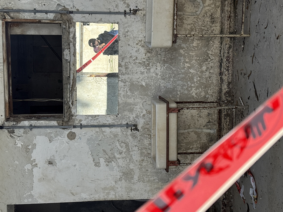 The image presents the interior of a dilapidated structure within the Yoav Regional Council, Israel. A severely weathered light-colored wall, exhibiting extensive peeling paint and visible repairs, occupies the background. In the upper center, an empty window frame opens to a dark, unseen interior. Directly below this, a rectangular mirror is mounted, reflecting two individuals. One individual, presumably the photographer, is visible from the chest up, wearing dark clothing and sunglasses, holding a smartphone. A pink/purple element is visible near their head. A second individual is partially reflected behind the first, wearing a dark jacket and a blue backpack. Two white, rectangular sinks on rusty metal stands are positioned on the floor, one beneath the mirror and another to its right. Vertical metal piping with spigots is affixed to the wall above the sink locations. A red and white barrier tape, marked with dark symbols, runs diagonally across the lower left foreground, partially obscuring the view of the concrete floor which is scattered with debris.
