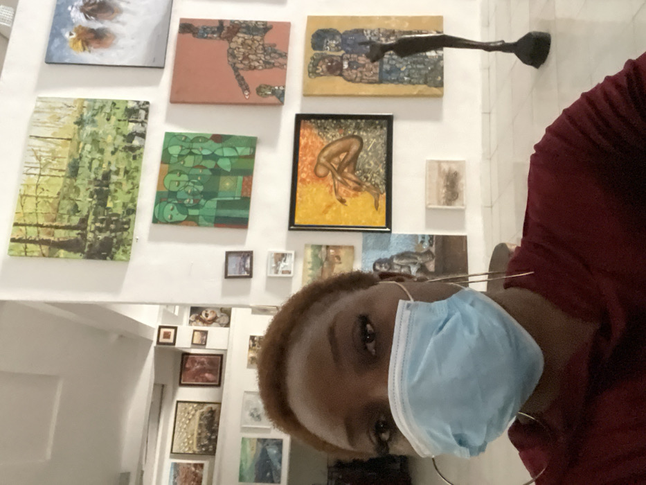 The image displays an indoor scene within an art gallery located in Abuja, Nigeria
