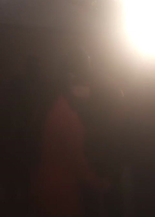 blurry, backlit scene. There appears to be at least one person present, possibly more, standing in a dimly lit area. One person is wearing a red shirt. Strong sunlight is shining from the upper part of the frame, creating significant lens flare and obscuring details. Palm trees are visible through the light. The image is generally dark and unclear.