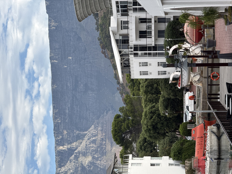 A high-angle, landscape-oriented shot features a mountain towering over white buildings and greenery. A clear, blue sky with scattered clouds sits on the left side of the frame. The mountain spans the background, its rocky texture detailed. Nearer, multi-story white buildings are nestled amidst trees. Lifeboats, painted primarily red and white, add color to the scene. A lifeguard ring hangs on a wooden structure.