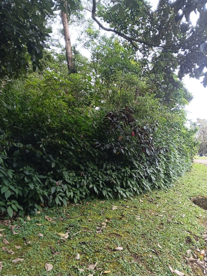 The image captures a ground-level view of a lush green landscape in Tây Ninh, Vietnam. The foreground consists of natural ground cover dominated by moss and short green grasses, intermingled with scattered brown leaves and small twigs. A dark, irregularly shaped object, possibly a rock or exposed root, is visible in the bottom right corner. A dense, undulating hedge of various shrubs and plants forms the midground, extending horizontally across the frame from left to right. This foliage primarily displays vibrant green leaves, with patches of darker, reddish-purple leaves interspersed, particularly towards the right-center. Small, light pink or purple flowers are visible among the green leaves on the lower left portion of the hedge. In the background, behind the dense shrubbery, taller trees with visible trunks and branches ascend towards a bright, overcast sky largely obscured by their canopies. On the far right, beyond the shrub line and a narrow strip of grass, a light-colored, curved pathway or road is faintly discernible, receding into the distance alongside additional trees. No people, animals, specific actions, or interactions are present. The scene depicts a natural or cultivated park-like environment.
