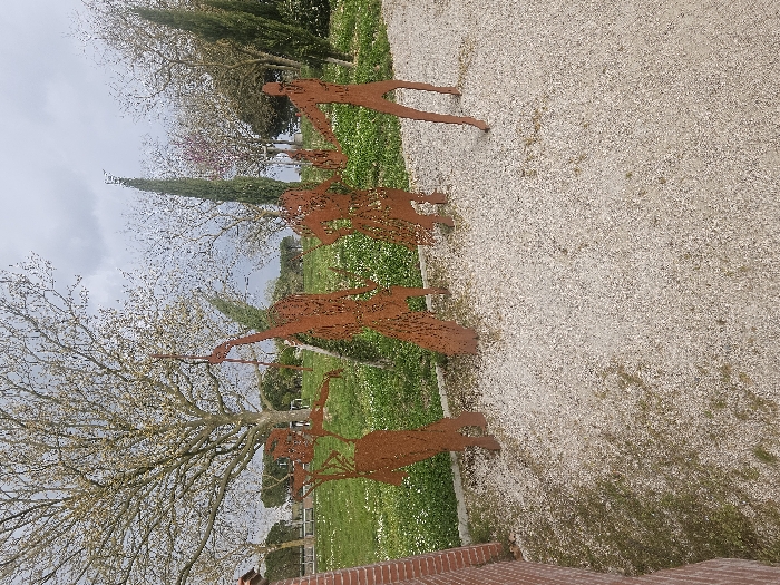 Four rusted metal cutout sculptures of human figures are positioned on a light-colored gravel path in Avignonet-Lauragais, France