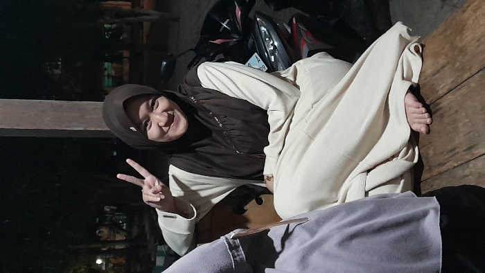 This image depicts a nighttime scene in Lhokseumawe, Indonesia. A young adult female with fair skin is centrally positioned, smiling directly at the camera. She wears a dark brown hijab over a light cream-colored long-sleeved dress. Her right hand is raised, forming a "V" (peace) gesture with her index and middle fingers. She is seated barefoot and cross-legged on a wooden plank surface. To the left, a second individual is partially visible, showing the back of a torso clad in a light purple long-sleeved garment. In the background, to the right of the primary subject, a dark vertical pillar is visible. A black Honda Vario scooter, identifiable by its design and a visible white license plate frame on its front, is parked behind the primary subject. The overall environment suggests an outdoor public area, with distant lights and trees blurred in the darkness.