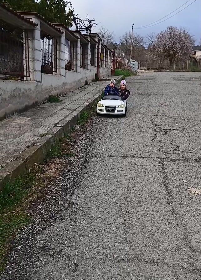 A child in a pink outfit on roller skates crosses behind a small, white, battery-powered toy car carrying two young children, moving from left to right in the video. The car is on a narrow, cracked asphalt road, flanked by a low stone wall with iron grillwork on one side. The setting seems to be a small village, with houses visible in the distance. The sky is overcast.