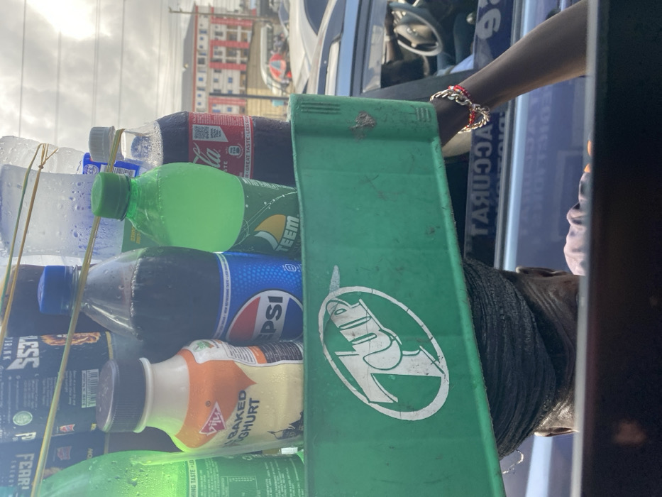An individual in Jakande, Nigeria, is observed from a vehicle, carrying a green plastic crate containing assorted beverages balanced on their head