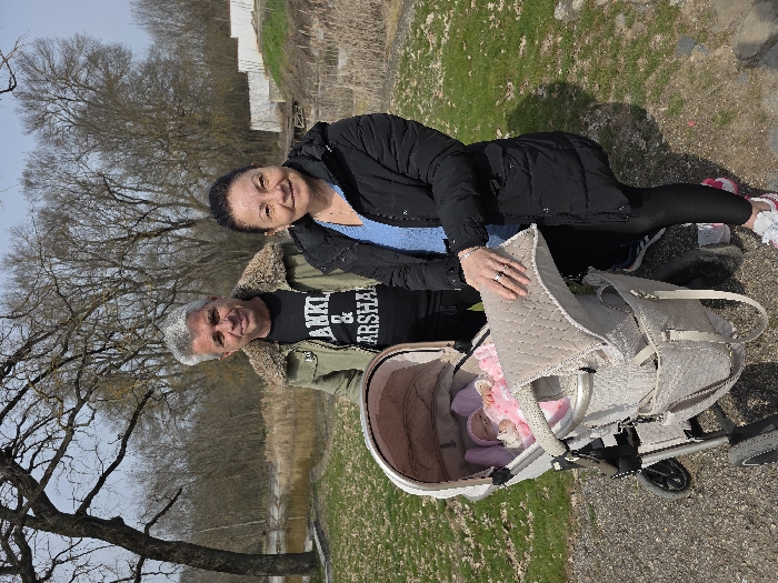 An outdoor scene captures three individuals next to a baby stroller, situated in a natural environment with a body of water and bare trees. The location is Unknown, Unknown. A light-skinned adult male with grey hair, wearing an olive green jacket with a faux fur collar over a black t-shirt displaying "FRANKLIN & MARSHALL" text, stands partially behind the stroller. To his right, a light-skinned adult female with dark hair, dressed in a black puffer jacket, a light blue top, black leggings, and white and pink athletic shoes, stands beside the stroller. Her right hand rests on the stroller's beige, quilted cover. Both adults are looking towards the camera with slight smiles. Inside the beige, bassinet-style baby stroller, an infant is visible, dressed in pink clothing and a pink hat, covered by a pink blanket or sleeper. The stroller features a light-colored frame and wheels, with a matching storage bag hanging below the bassinet. The background consists of numerous bare deciduous trees under a bright sky. A body of water with reeds or dry grass along its banks is visible behind the individuals. On the far right, a low, white structure resembling a wall or building foundation is present beyond the water. The ground is a mix of dirt, small stones, and sparse green patches.