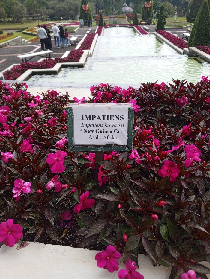A flower bed displays impatiens with vibrant pink flowers and dark reddish-purple leaves. A sign identifies them as Impatiens hawkerii "New Guinea Gr." and "Asal : Afrika." Behind the flowers, a tiered water feature stretches into the distance, flanked by matching flower beds. People are visible on the upper tier. Tall topiary shrubs and trees decorate the area.