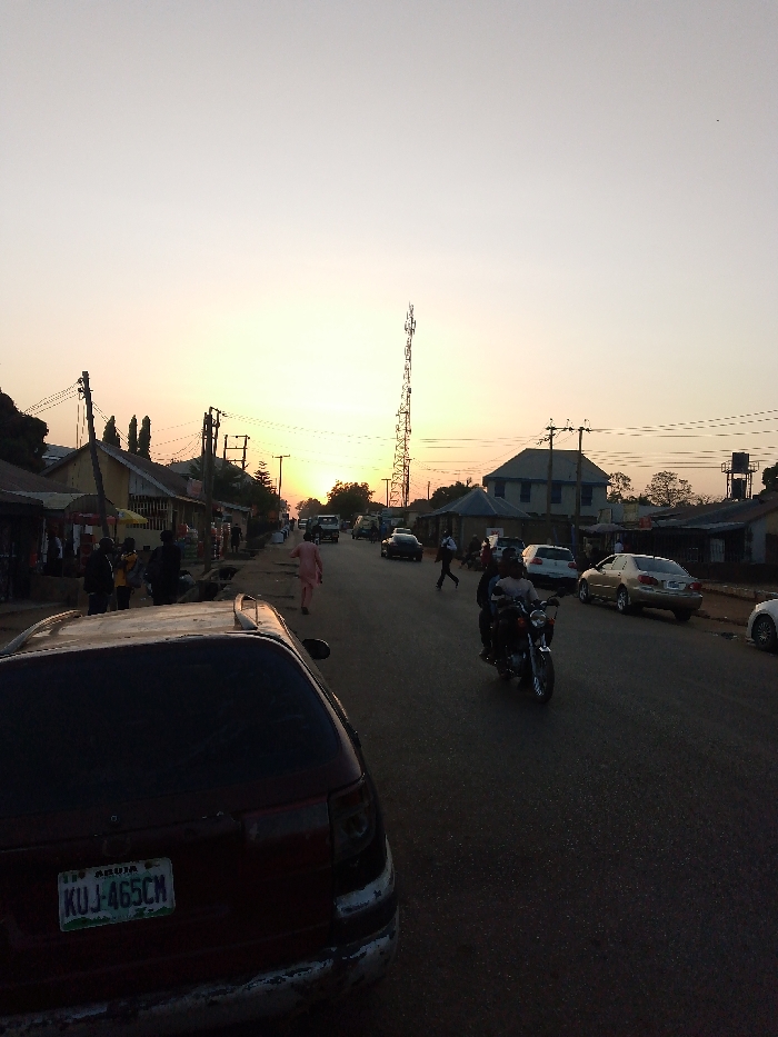 - "A street scene at dusk features a tall communication tower in the distance where the setting sun shines brightly" by FM-n3M7H3, licensed under CC BY 4.0