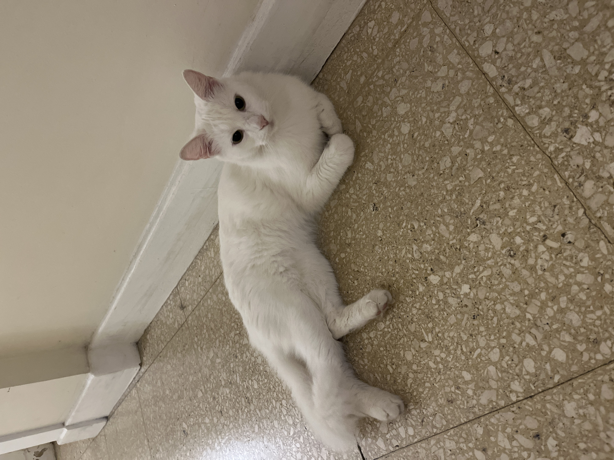 A white cat lies on a terrazzo tile floor adjacent to a wall with white baseboards. The cat is looking at the camera. The location is assumed to be Buenos Aires, Argentina, based on the presence of terrazzo tiles which are common in older buildings there.