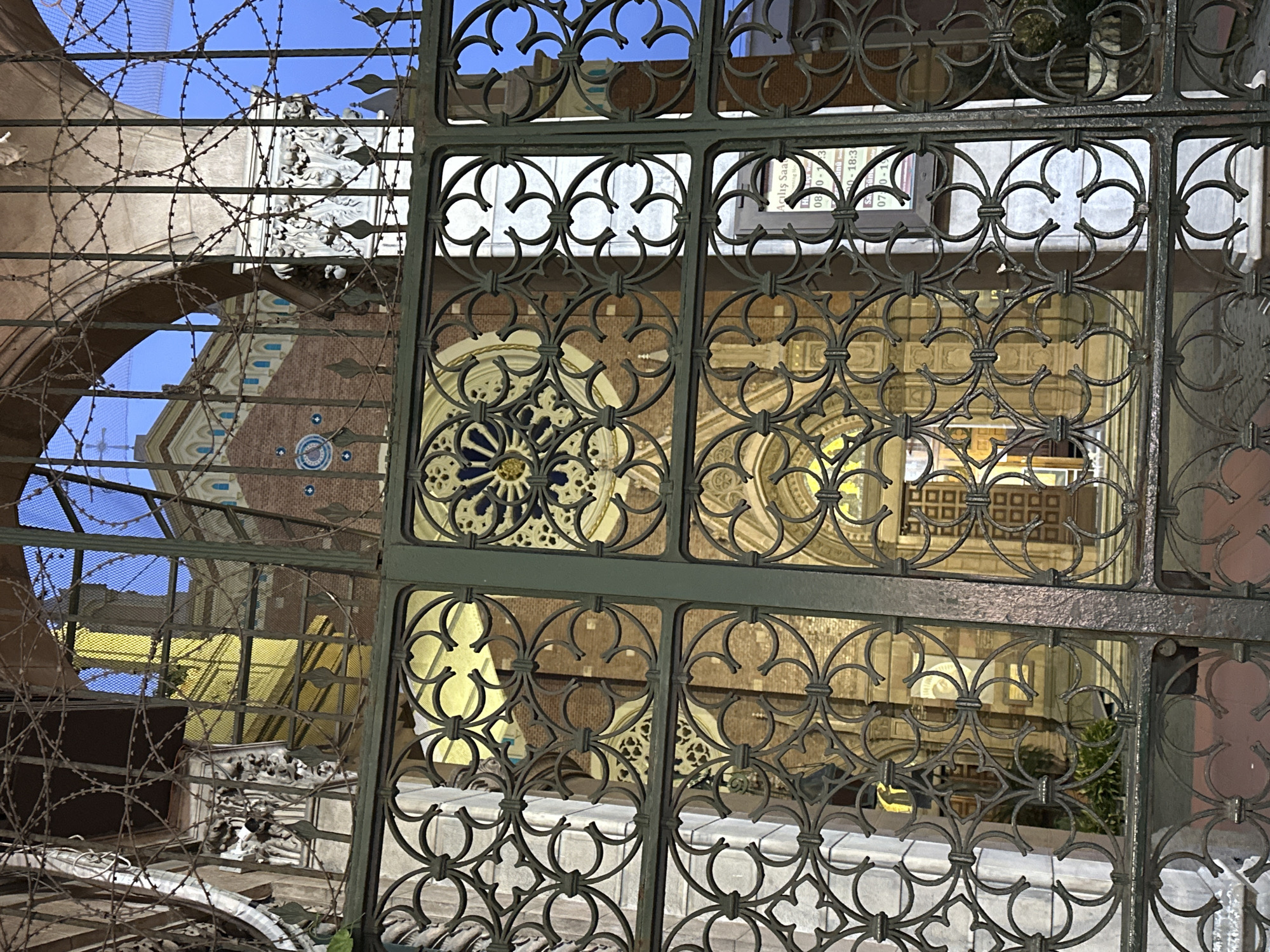 The image displays an eye-level view through a dark, ornate metal gate into the courtyard and facade of the Church of St