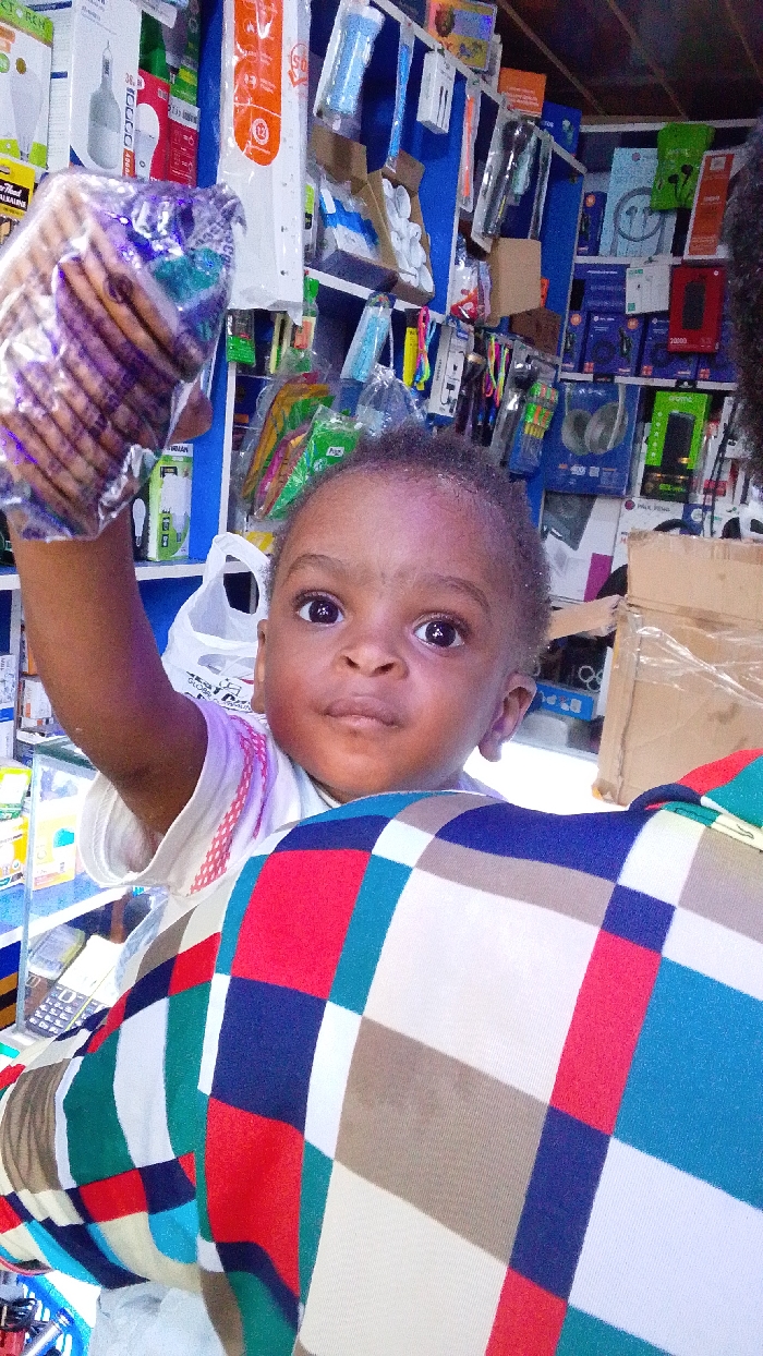 The image displays a young child, approximately 1-3 years old, with dark skin and short, dark hair, positioned in front of an adult. The child wears a light-colored t-shirt with subtle striped patterns on the sleeves and looks directly at the viewer with wide, dark eyes and a neutral expression. The child's left arm is raised, holding a transparently wrapped package of multiple round biscuits. The adult's upper back, partially visible in the foreground's lower right, is clothed in a fabric featuring a multicolored checkered pattern composed of red, blue, green, white, beige, and light brown squares. The background indicates an indoor retail setting, consistent with a shop in a commercial area of Onitsha, Nigeria. Blue-backed shelves and display units are densely stocked with various items. Merchandise includes packaged electronics such as headphones (one grey pair prominently displayed), earbuds, mobile phone accessories like chargers and cables (some in colorful plastic packaging), and light bulbs in white and red boxes. A white plastic shopping bag with text is visible on the left, and a cardboard box is on an upper shelf to the right. A mobile phone with a numerical keypad is discernible on a lower shelf to the left of the adult. The scene is adequately lit, portraying a typical general goods or electronics establishment.
