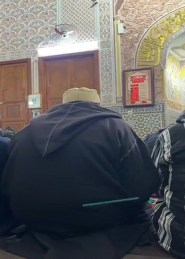 scene inside a mosque. Several men are seated on the floor, facing forward, presumably engaged in prayer or meditation. The men are wearing various types of robes or hooded garments. One man is wearing a black hooded robe with a light-colored cap, while another is in a black and white checkered robe. The camera pans slightly from left to right, revealing more men in similar attire. The interior of the mosque is adorned with intricate tile work and ornate carvings. There are wooden doors, a digital display with red numbers, and a decorative niche with a light fixture. A small fan is visible near the ceiling. The scene appears peaceful and solemn.