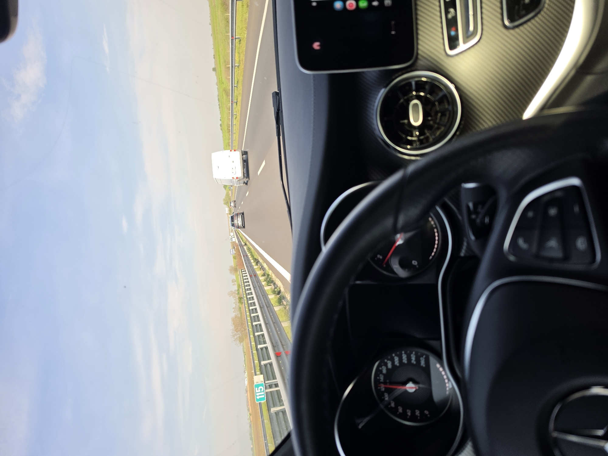 interior of a car, specifically the driver's perspective. A black steering wheel dominates the foreground, partially obscuring the dashboard. The dashboard features air vents, a screen, and various controls. Through the windshield, a highway stretches into the distance under a slightly overcast sky. There are other vehicles on the road, including a white box truck. Roadside barriers and vegetation are visible along the sides of the highway. A sign showing "115" can be seen. The location is unknown.