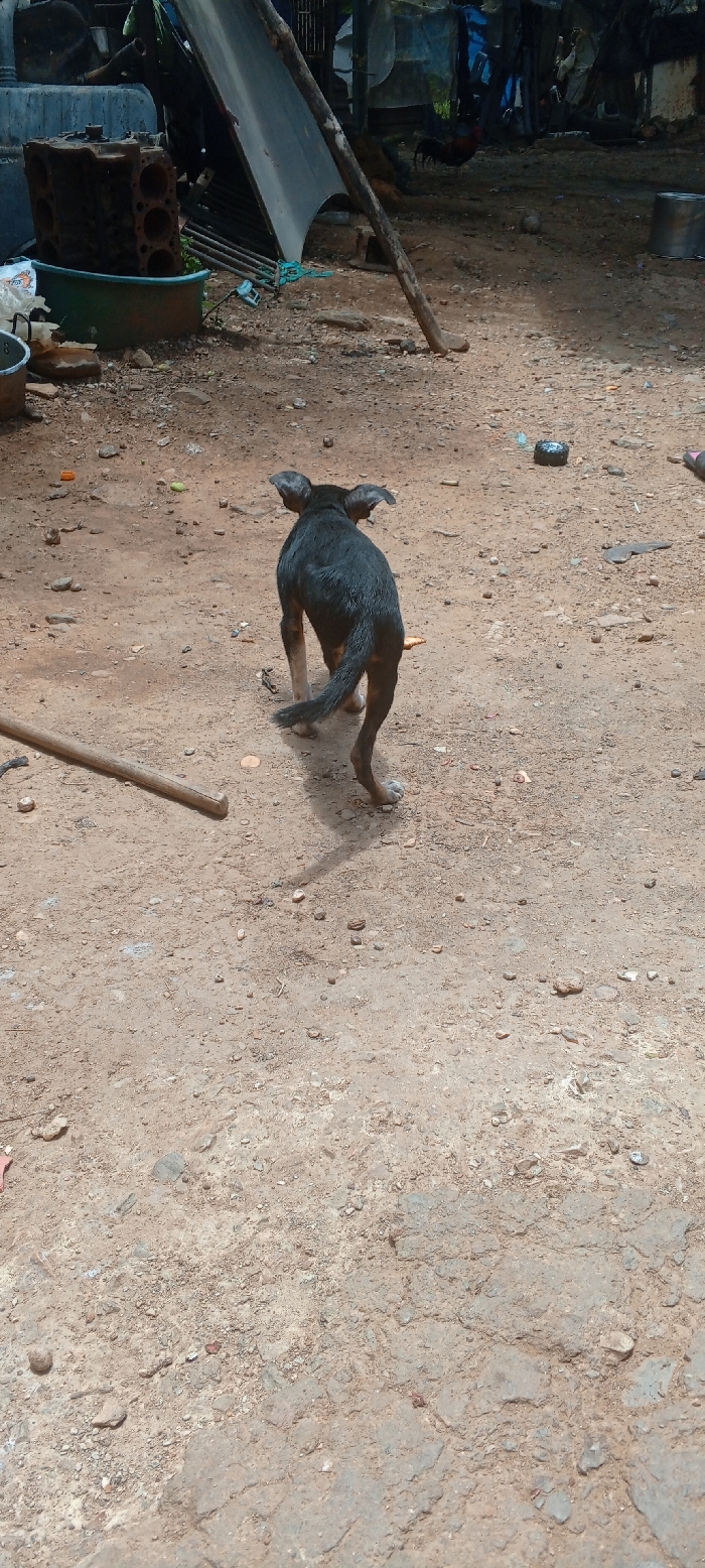 A black dog with white paws walks away from the camera, looking over its shoulder. The dog is on a dirt path in Parroquia Guevara, Venezuela. The ground is covered in dirt and small rocks. There are some metal objects in the background. The dog is in the center of the frame. The background of the image is blurred, but it appears to be a cluttered yard with some trees and buildings in the distance. The sun is shining.