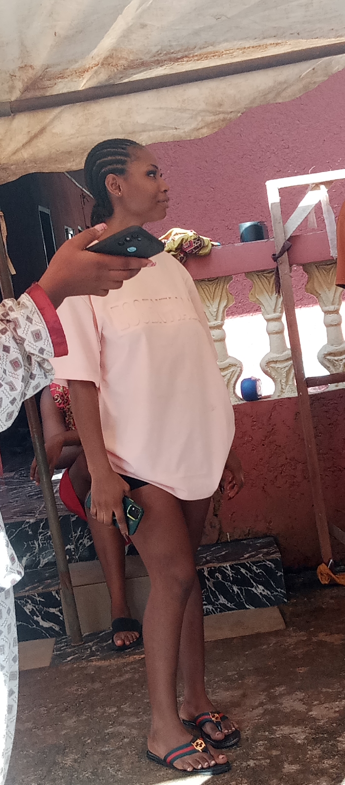 The image depicts an outdoor or semi-outdoor setting within Udi, Nigeria; a specific address or landmark is not identifiable. A young adult female with dark skin and cornrow braids stands centrally, wearing a light pink oversized t-shirt with "ESSENTIALS" embossed on the front, black shorts or underwear, and dark flip-flops featuring red, blue, green stripes, and a gold circular emblem. She holds a green-cased smartphone in her right hand and directs her gaze towards the upper right. To her left, the hand of another individual, sporting pink fingernail polish and wearing a white patterned long-sleeved garment, holds a dark smartphone with a visible triple camera array, pointing it towards the standing female, indicative of a photo or video capture. A third individual is partially visible in the mid-background, seated, wearing a red garment and black furry slides. The background features a textured maroon wall, fronted by a low, light-colored decorative balustrade with a darker red base. Above, a white, stained canvas or tarp serves as a canopy, supported by a dark horizontal bar and vertical poles. The ground is composed of concrete and sections of black-and-white marbled material. Incidental objects include a blue cylindrical item and a piece of yellow fabric resting on the balustrade.