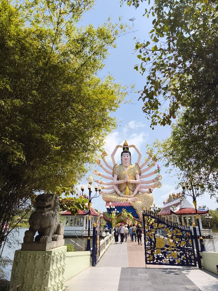 A large, golden statue of a multi-armed deity sits atop a bridge leading towards a temple. The statue is adorned with a crown and has a peaceful expression. The bridge is flanked by stone lions and ornate, blue and gold gates. Lush green trees frame the view, creating a natural archway. People can be seen walking across the bridge towards the statue. The sky is blue with scattered clouds.