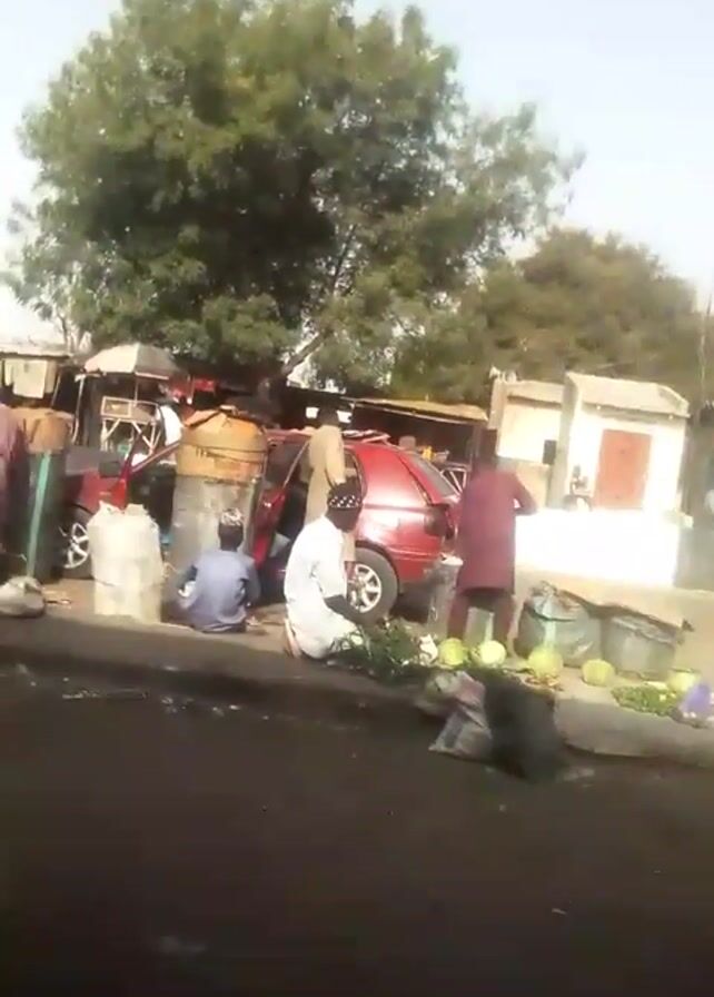street scene with several people and a red car. Some people are sitting on the ground near what appears to be produce. Other people are standing and talking. There are buildings and trees in the background. A man is then shown in the foreground, appearing to film the video.