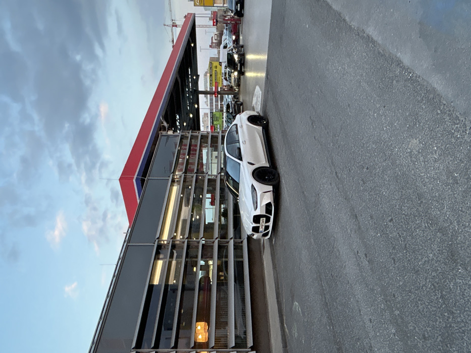 The image depicts an OMV petrol station located at Tržaška cesta 200 in Ljubljana, Slovenia, during what appears to be late afternoon or early evening. In the foreground, a white BMW M3 (G80 generation) sedan with black wheels is parked or stationary on an asphalt surface, positioned to the left of the frame. Its front license plate displays "LJ M3BMW". The asphalt surface appears damp in areas. To the left of the BMW is a modern building structure featuring a dark gray facade with prominent horizontal louvered panels or slats, some of which appear to be windows revealing illuminated interior spaces. Dominating the midground and right of the frame is a large, cantilevered canopy, colored red on top and blue underneath, extending over multiple fuel pump islands. Several vehicles, including cars and vans of various makes and models, are visible queuing or positioned near the fuel pumps under this canopy. Streetlights are illuminated beneath the canopy. The background shows a cloudy sky with varying shades of blue, gray, and subtle hints of orange/pink, indicative of twilight. In the distance, one or more construction cranes are visible against the skyline, suggesting ongoing development in the area. No specific individuals are clearly identifiable or performing discernible actions in the immediate foreground, though occupants are presumed within the vehicles.