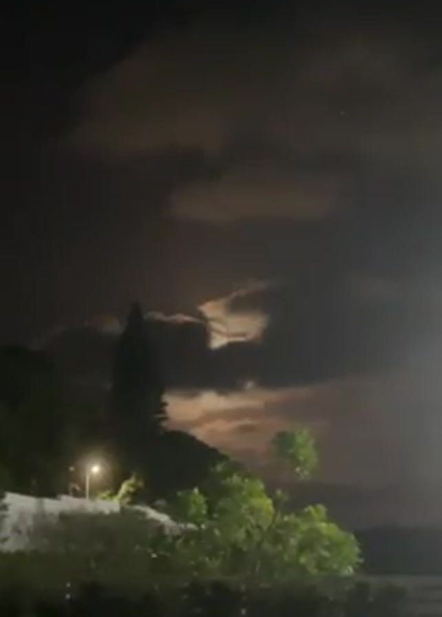 night scene with a cloudy sky and a bright moon. The moon is partially obscured by clouds. In the foreground, there are trees and vegetation. A street light is visible in the distance. The overall scene is dark and somewhat eerie.