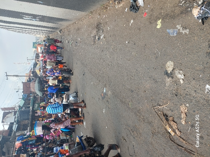 A crowded street market is seen in an urban environment. People are clustered together, some carrying umbrellas. Stalls line the side of the road, displaying various goods. The road is cluttered with litter and debris. A large concrete structure with black and white stripes runs along the side of the street, possibly an overpass or bridge. The overall scene depicts a busy, possibly impoverished, commercial area.