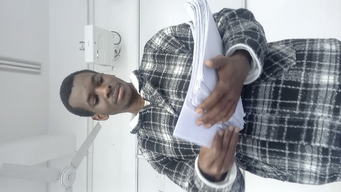A man in a black and white plaid coat holds a stack of white papers. The man has short black hair and dark skin. He is in a room with white walls and medical equipment. A ceiling fan is also visible.