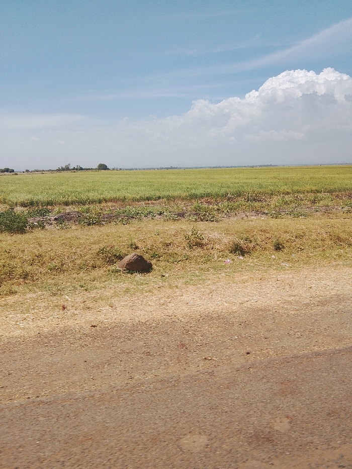The image depicts a rural landscape in Mutithi, Kenya, under a clear to partly cloudy sky. In the immediate foreground, a light brown dirt road with visible gravel and irregular texture extends across the bottom third of the frame. Adjacent to the road, a strip of dry, yellowish-brown grass and sparse green vegetation is present. A dark brown, irregularly shaped object, consistent with a rock or mound of earth, rests on this grassy strip, positioned left of the image's vertical center. Beyond this, an expansive field of vibrant green crops, possibly a grain, stretches horizontally across the midground. The field appears uniformly cultivated. In the distant background, a faint line of trees or structures is discernible on the horizon. The sky, occupying the upper portion of the image, is a light blue with scattered white cumulus clouds, including a large, prominent cloud formation on the right side. No human figures, animals, or active interactions are visible within the scene.