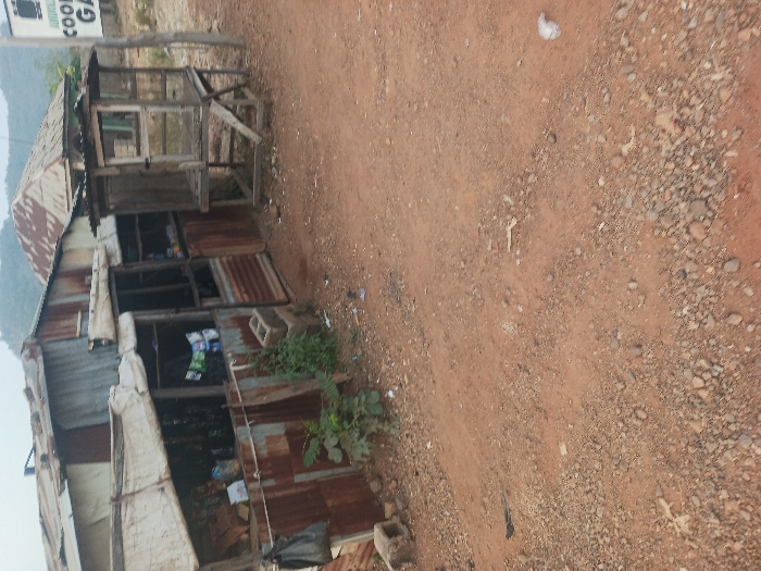 A roadside view features dilapidated shacks, likely serving as small shops, constructed from corrugated metal and weathered wood