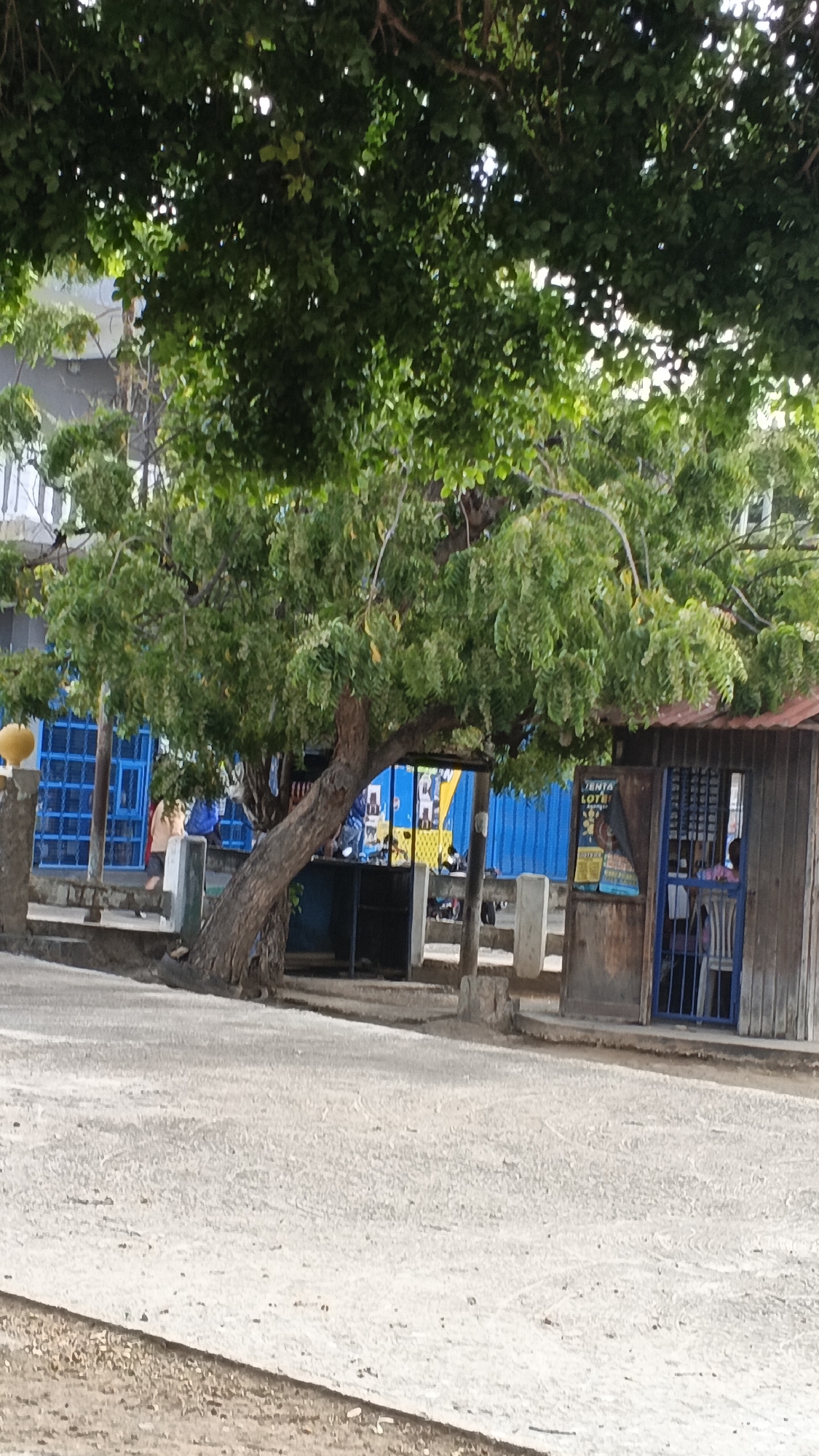 The image depicts a street scene in Juan Griego, Venezuela, characterized by a large, leafy tree that dominates the foreground. The tree's branches extend across the upper portion of the frame, providing shade. Beneath the tree, several structures and objects are visible. There is a blue metal fence or barrier, a wooden structure with a barred window possibly a small shop or stall, and concrete pillars. The ground is paved, showing signs of wear and discoloration. People are present, although somewhat obscured by the tree and other objects. At least one person is sitting inside the small shop or stall. The overall impression is of a typical urban environment in Juan Griego, with a mix of natural and man-made elements.