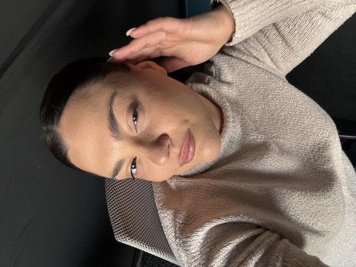 The image depicts a rotated portrait-style shot of an adult female individual, positioned with her head towards the top right and body extending towards the lower left. She has dark hair pulled back from her face, fair skin with light makeup, and appears to be looking directly at the viewer. Her right hand is raised, fingers lightly touching the side of her head above her ear, with manicured nails visible. She wears a light-colored, possibly beige or oatmeal, long-sleeved knitted sweater with a visible textured pattern. The background consists of a dark, uniform surface behind her, and a light-colored, possibly mesh-backed, chair is partially visible behind her left shoulder and neck. The environment appears to be an interior setting. There are no identifiable landmarks or unique features within the frame to confirm a specific location in the city of Sofia, Bulgaria.