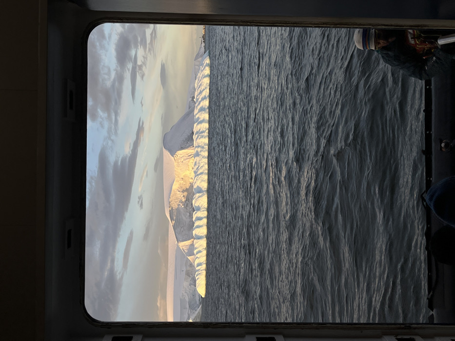 A window frames a view of sea and land, possibly from a ship. To the left, a dramatic mountain range rises, capped with snow and illuminated by a low sun. The sky is filled with wispy clouds. To the right, the sea is dark and choppy, reflecting the light in long streaks. Part of a person and some ship fixtures are visible in the upper right corner of the frame. The photograph is taken from inside the ship.