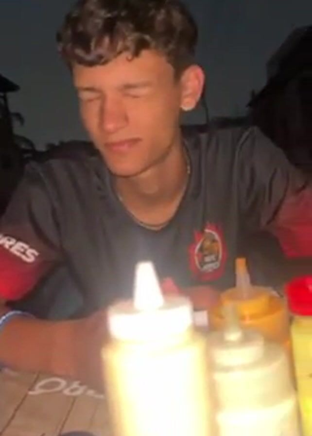 A video depicts two young men seated at a table outdoors. The table is covered with a printed design and holds various condiments in squeeze bottles, including white, yellow, and red. One of the men is wearing a dark-colored t-shirt with a red sleeve, while the other is wearing a white t-shirt. Initially, both men appear relaxed, but the second man uses a spatula to flip a portion of food toward the camera before putting his face up to the camera. The background is dark, hinting at nighttime. Buildings and possibly trees are visible in the distance.