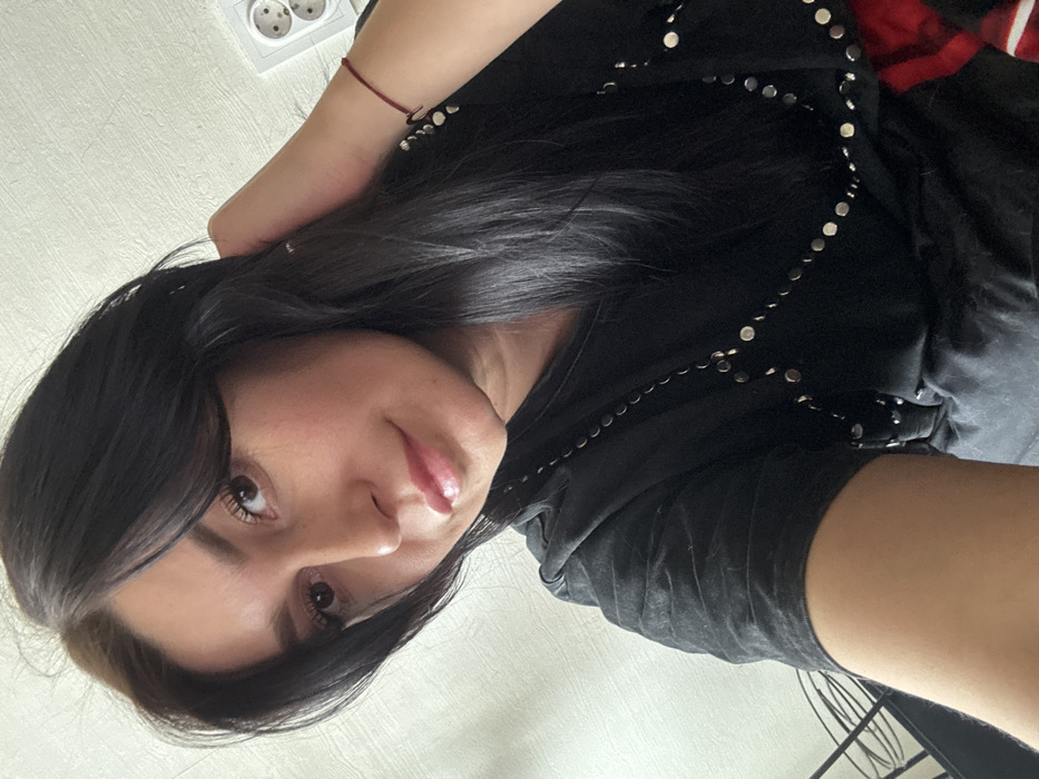A female subject is depicted in a close-up, indoor portrait, angled slightly to the viewer's left, directly facing the camera. She has long, dark brown hair with bangs, and light-toned skin. Her eyes are open, and her lips are slightly parted, showing a glossy pink finish. She wears a dark, possibly black, short-sleeved top or t-shirt, embellished with multiple small, circular metallic studs arranged in lines across the chest and shoulder. Her right hand is raised, with fingers partially intertwined in her hair near her right temple. A thin, dark red string bracelet is visible on her right wrist. The background consists of a light-colored, textured wall. In the upper right quadrant of the image, a white electrical outlet with two circular sockets is visible. A dark, indistinct object, possibly furniture, is partially visible along the far-left edge of the frame. The specific location within the city of Chaikovsky, Russia, cannot be determined from the visual evidence provided in the image.