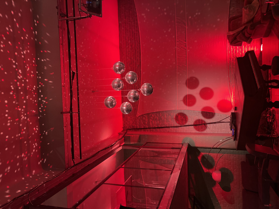 The image depicts an interior space within Roubaix, France, presenting as an event venue or lounge, illuminated predominantly by red ambient lighting. A metal-framed mezzanine with a transparent railing is situated along the left side of the scene. Walls feature exposed brickwork, partially covered by a large, light-colored fabric backdrop on the right. The ceiling exhibits an industrial design with visible structural beams and track lighting fixtures. Seven mirrored disco balls are suspended at varying heights from the ceiling in the central-right area, reflecting the red light and projecting numerous small, shimmering red and white light points onto the ceiling and backdrop. An eighth, smaller disco ball is visible higher and further to the right. A dark-toned grand piano is positioned centrally in the foreground, with a small electronic mixer resting on its lid. Furniture includes a dark sofa partially visible on the far left and a plush red armchair with a draped blanket on the far right. A multi-headed floor lamp with a red shade is located beneath the mezzanine. Electrical cables are visible on the floor near the piano and running vertically along a wall support. No individuals are present in the scene.