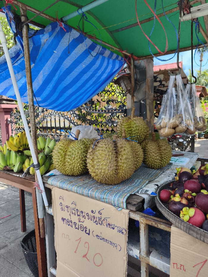 A fruit stand is laden with vibrant produce. Bunches of green bananas sit beside spiky durians. A tray overflows with deep purple mangosteens. Clear plastic bags hang above, filled with light brown sapodilla fruits. A sign advertises the durian, noting its type and a price of 120 per kilogram. The stand is shaded by a green and blue striped awning. A black basket sits beneath the table, providing storage.
