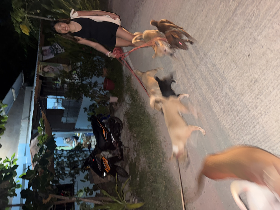 This nighttime image depicts a residential scene in General Luna, Philippines. An adult female, appearing to be of East Asian descent, is observed walking on a paved surface, moving from right to left. She has long dark hair, is smiling towards the camera, and wears a black sleeveless romper. A light-colored tote bag is slung over her left shoulder. In her right hand, she holds multiple red leashes attached to a pack of at least six dogs. The dogs are in motion, exhibiting significant blur, and include individuals with tan, light brown, dark brown, and black fur. In the background, a light-blue single-story house with a corrugated metal roof is visible. Its front entrance is illuminated, revealing a person partially seated inside. Two vertical banners, featuring images of people, are affixed to the house above the entrance. To the left of the house, a black and orange scooter is parked on a grassy patch. Various potted plants and foliage are arranged around the house and along the path. The overall illumination suggests artificial light sources from the house and potentially street lighting.