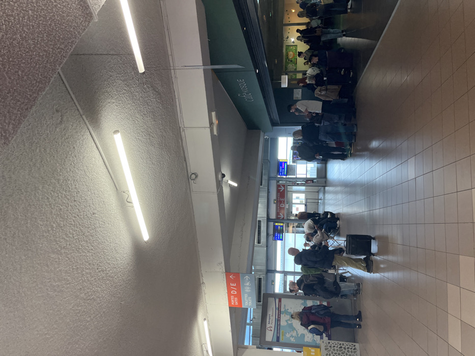 n airport terminal in Tillé, France (latitude: 49.459, longitude: 2.111). The terminal is a large, open space with a high ceiling. There are several people waiting in line, likely for check-in or security. Some people are seated, while others are standing. There are several pieces of luggage in the scene. The terminal has a tiled floor. In the background, there is a sign that says "Cafe Mosquee." There are also signs for "portes gates" and "toilettes toilets" with arrows pointing to their respective locations. The terminal appears to be brightly lit by fluorescent lights.