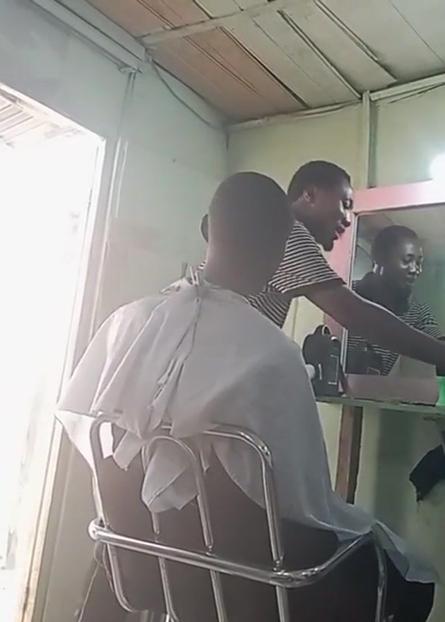 barber cutting a man's hair in a small barbershop
