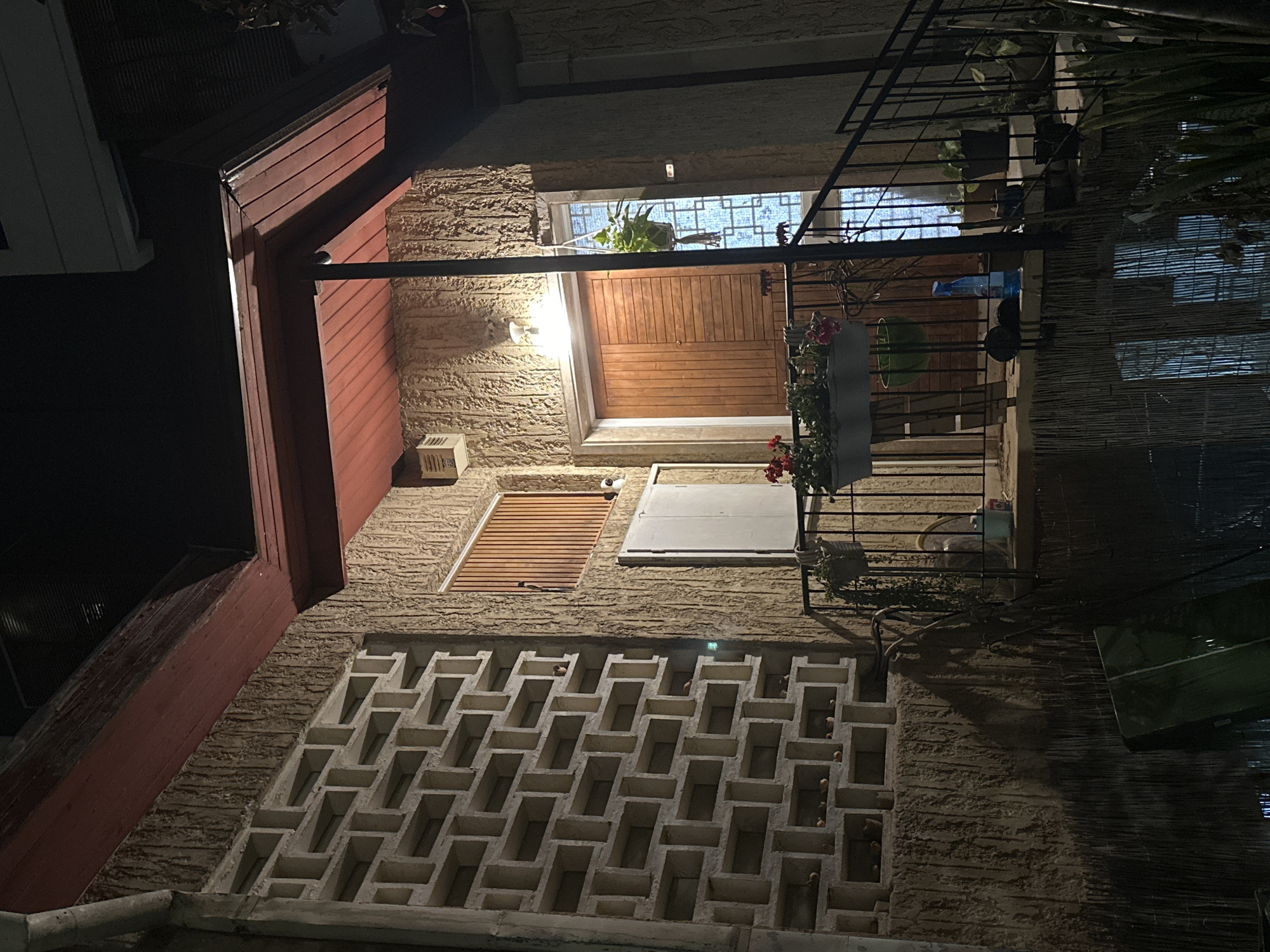 The image depicts a nighttime view of a residential entrance in the city of Givatayim, Israel. The scene is illuminated by an overhead light fixture above the door and ambient light emanating from inside the building. The building exterior features a textured, light brown stucco-like finish. To the left, a prominent light-colored concrete block wall displays an open, geometric rectangular pattern, with multiple small, reddish-brown terracotta pots placed within its horizontal recesses. A light-colored vertical drainpipe runs along the far-left edge of this wall. A reddish-brown wooden plank canopy, supported by a dark vertical post, extends over the entrance. The entrance itself consists of a vertical-slat wooden door. Above the door is a horizontal window fitted with light brown wooden slats. To the right of the door, another window is visible, covered by a decorative metal grill and illuminated from within. A black metal railing with vertical balusters indicates a set of stairs leading to an elevated entrance platform. On this platform, behind the railing, various potted plants are arranged, including a long white planter box containing red flowers (likely geraniums) positioned on the railing itself. A green hanging plant in a macrame hanger is suspended from the canopy near the center. Additional items on the platform include a blue spray bottle and several dark, possibly decorative, objects. Two white security cameras are mounted on the wall: one above the right side of the doorframe and another near the top right corner of the window with wooden slats. A white rectangular utility box is affixed high on the wall to the left of the entrance. The lower portion of the wall below the entrance platform is covered with a woven bamboo or reed matting. Tall, green, blade-like plants are visible in the immediate foreground at the bottom right. No individuals are present in the scene.