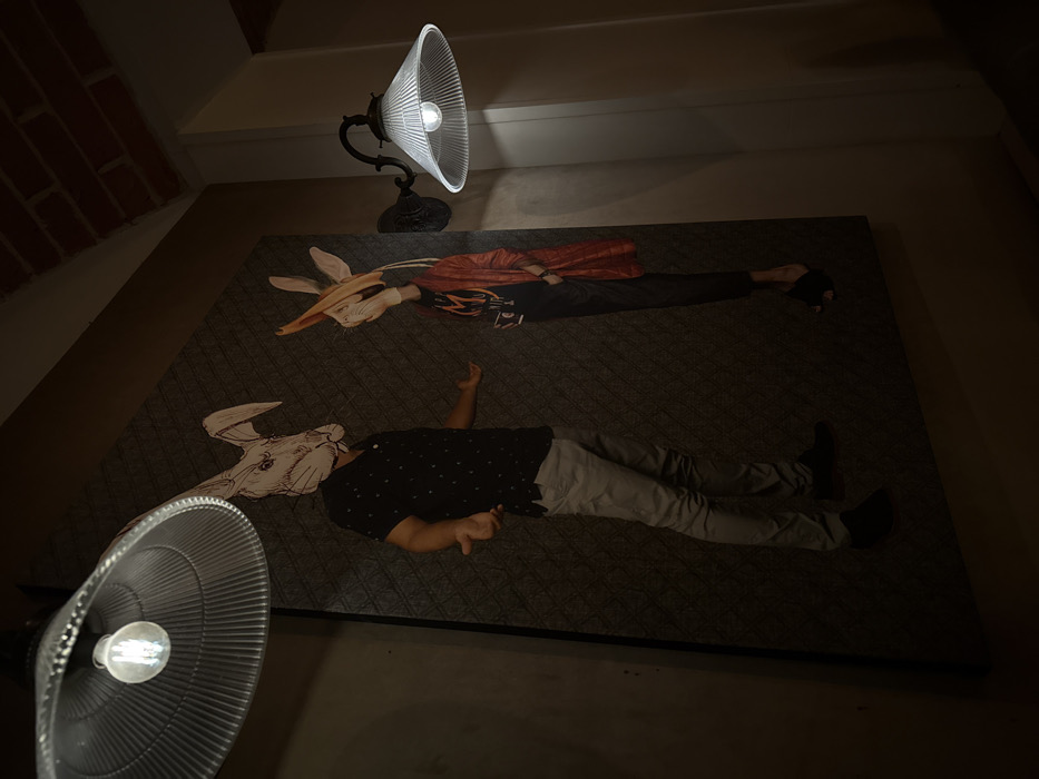 The scene depicts an interior view of a dimly lit establishment in Varna, Bulgaria. A large, dark-toned artwork or mural on the wall features two anthropomorphic figures with animal heads. A male individual is positioned in front of the left figure in the artwork, aligning his body such that his head is obscured by the depicted rabbit head. He is wearing a dark, short-sleeved patterned shirt, light grey trousers, and dark shoes, with both hands extended forward, palms open in a gesturing posture. The figure on the right within the artwork portrays an individual with a similar rabbit-like head, dressed in a dark shirt with an orange "M" logo, an open red jacket, dark cropped pants, and black slides, holding a camera on a neck strap. Illumination is provided by two wall-mounted light fixtures, each featuring a ribbed, bell-shaped clear glass shade and an exposed incandescent bulb. One fixture is visible in the upper left foreground, and the other is in the upper right midground. A section of exposed brickwork is visible on the ceiling above the right light fixture.