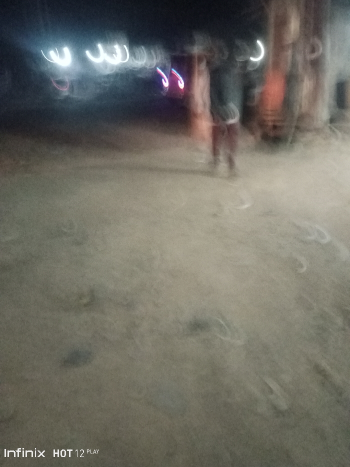 A blurry, dimly lit image shows a dirt ground surface. At the back, indistinct figures, possibly people, are visible. The lighting, which is streaky and blurred, suggests motion or a slow shutter speed. The scene is predominantly gray and brown, with some areas of brighter light. The focus and clarity are poor. "Infinix HOT 12 PLAY" is written in the bottom left corner.