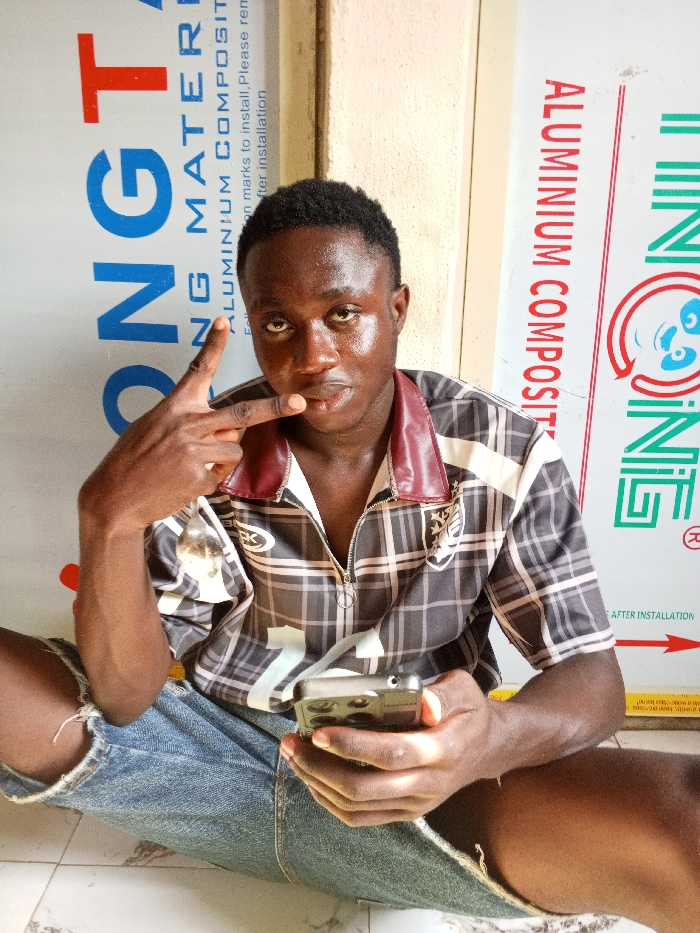 A young male is depicted sitting on a light-colored tiled floor against a wall covered in metallic advertising panels in Ihiagwa, Nigeria. He has a dark complexion, short dark hair, and directly faces the camera with a neutral expression. He is wearing a short-sleeved, collared plaid shirt in shades of dark grey, light grey, and white, featuring a maroon collar and a half-zip closure. Light blue denim shorts, distressed at the knees, cover his lower body. His left hand holds a silver-colored smartphone, while his right hand is raised, forming a "V" sign with the index and middle fingers, with the thumb resting near his lower lip. The background panels are primarily white and light grey, featuring large vertically oriented text in blue and red. Visible text includes "ONGT," "NG MATERIAL," "ALUMINIUM COMPOSITE," and "TINONG," along with an instruction: "installation marks to install, Please rem after installation." A registered trademark symbol is also visible. The setting appears to be a commercial or retail space specializing in building materials.