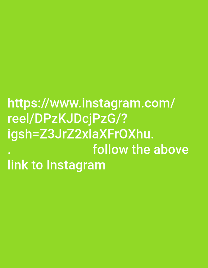 The image displays a solid lime green background. White sans-serif text is present in the lower-left quadrant. The text reads: "https://www.instagram.com/reel/DPzKJDcjPzG/?igsh=Z3JrZ2xlaXFrOXhu. follow the above link to Instagram". There are no discernible people, subjects, objects, actions, or interactions within the visual content of the image beyond the text itself. The environment depicted is a flat, two-dimensional digital graphic. The location in a city is not applicable as the image is a graphic and does not depict a physical space.