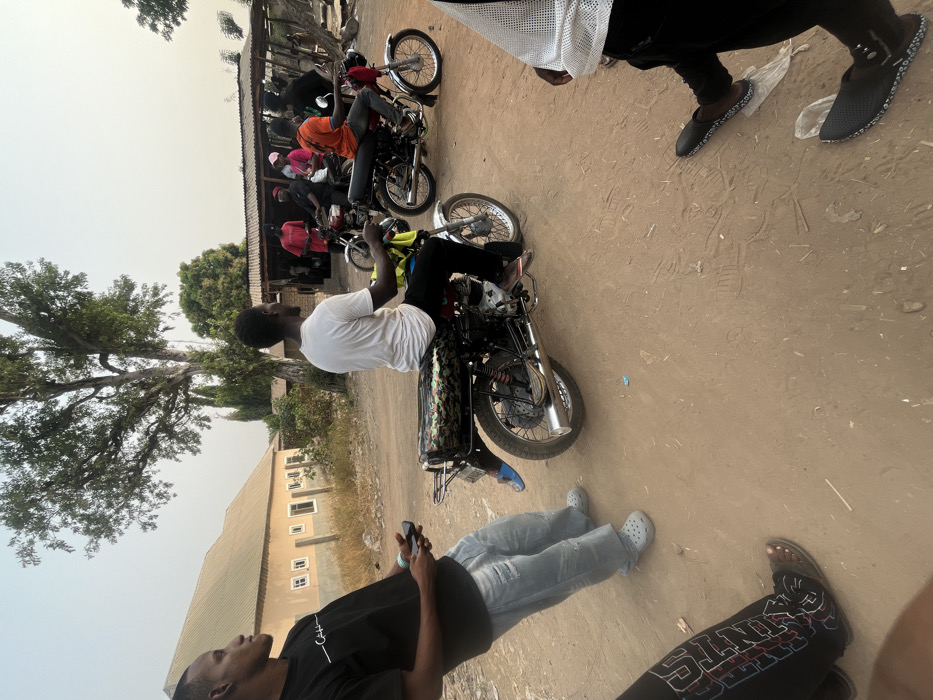 A group of men gather on motorcycles on a dusty road. Several are seated on their bikes. One man in a white shirt sits sideways on his motorcycle. Another man, wearing a black shirt and light blue jeans, looks up while holding a mobile phone. Buildings and a large tree are visible in the background under a hazy sky.